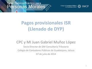 Este documento presenta información sobre los pagos provisionales del Impuesto Sobre la Renta (ISR) en México. Explica los elementos constitucionales y legales que establecen la obligación de pagar impuestos. Define conceptos clave como ingresos, personas morales y coeficiente de utilidad, los cuales son necesarios para calcular los pagos provisionales del ISR. También describe la mecánica para determinar el coeficiente de utilidad en diferentes escenarios y situaciones como fusiones o escisión de empresas.