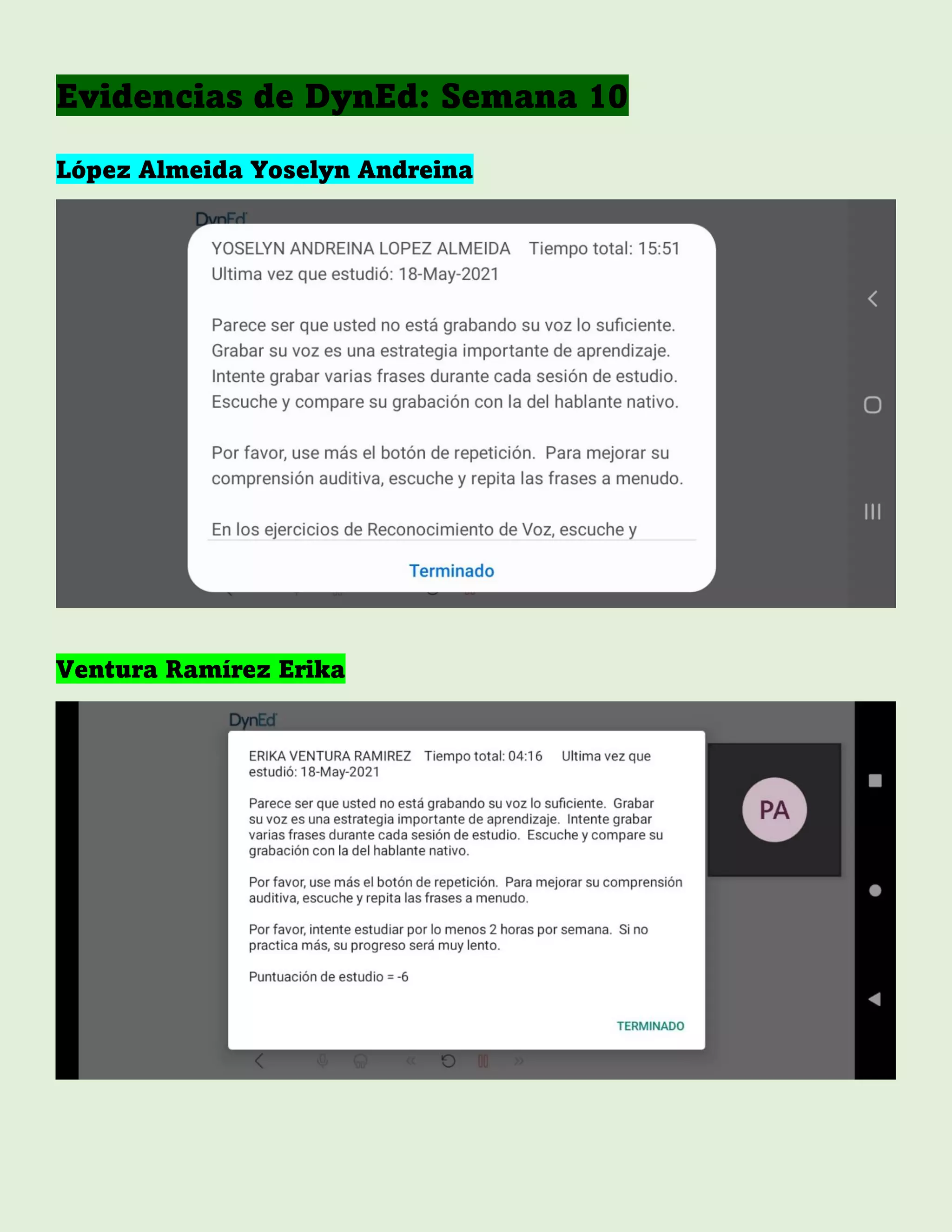 Algunas estudiantes no pudieron asistir a clase o avanzar en DynEd debido a citas médicas. Una estudiante en particular, Denisse, no pudo asistir a clase ni avanzar en DynEd porque tenía una cita con el doctor, pero reportó su falta y enviará su avance pronto.