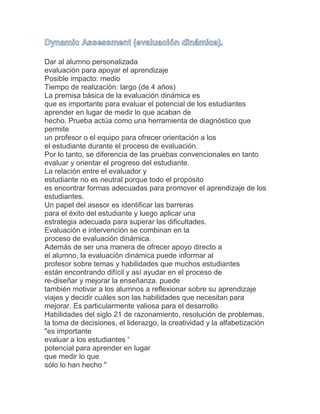 La evaluación dinámica se centra en medir el potencial de los estudiantes para aprender en lugar de simplemente lo que han logrado, combinando evaluación e intervención para fomentar el aprendizaje. Utiliza métodos como la prueba previa, intervención y post-prueba para guiar a los estudiantes y ofrecer retroalimentación personalizada, beneficiando el desarrollo de habilidades del siglo 21. A pesar de las críticas sobre su fiabilidad, se considera que la evaluación dinámica proporciona inferencias sólidas sobre el progreso del estudiante y apoya su aprendizaje individualizado.