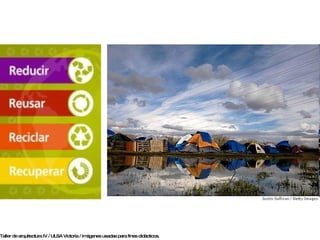 El documento presenta varias citas sobre la arquitectura y la vivienda popular. También describe viviendas improvisadas construidas con materiales de desecho y las características de estos asentamientos precarios. Finalmente, proporciona las características generales para el desarrollo de prototipos de viviendas sustentables construidas con materiales reciclados.