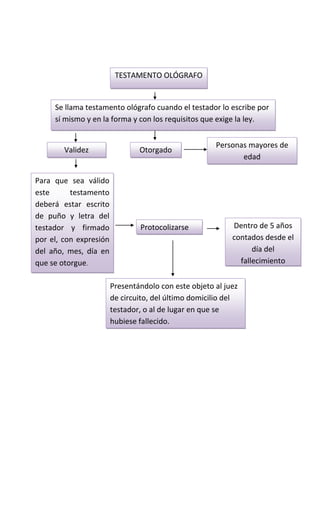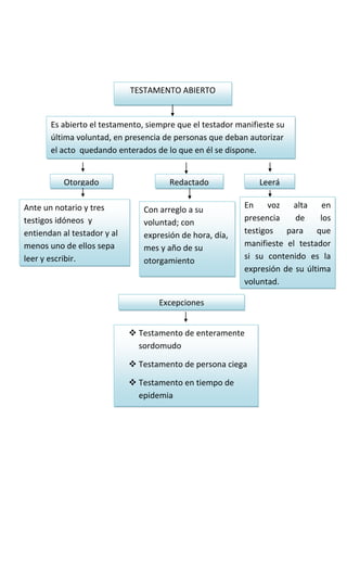 El documento describe diferentes tipos de testamentos en Panamá, incluyendo testamentos ológrafos, abiertos, militares, marítimos y en el extranjero. Explica los requisitos y procedimientos para la presentación, apertura, protocolización y autenticación de cada tipo de testamento.