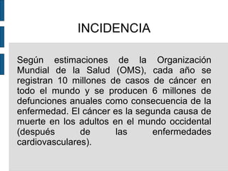 El cáncer se define como un crecimiento anormal y continuo de células que pueden invadir otros tejidos y propagarse a distancia del sitio original, formando tumores. Cada año se registran 10 millones de casos de cáncer en el mundo y 6 millones de muertes, siendo la segunda causa de muerte en los países occidentales. Algunos factores de riesgo que pueden provocar cáncer incluyen la herencia, infecciones, radiaciones, productos químicos y alteraciones en el sistema inmunológico. La detección temp