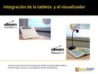 El documento describe las nuevas funcionalidades del software Scrapbook, incluyendo acceso directo a las herramientas desde la tableta eBeam Inscribe 200e, recepción dual para que dos personas escriban simultáneamente, compatibilidad con formato FLV para reproducir videos en la web, hipervínculos ampliados, plantillas prediseñadas, y licencias de software para usar las herramientas sin conexión.