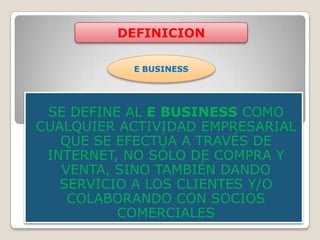 El documento define e-business y e-commerce, y describe sus ventajas y desventajas. E-business se refiere a cualquier actividad empresarial a través de Internet, mientras que e-commerce comprende la compra y venta de productos y servicios en línea. Las principales diferencias son que e-business incluye procesos internos como producción e inventario, mientras que e-commerce se enfoca más en las ventas y el marketing.