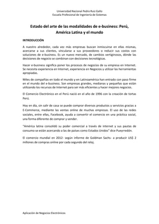 Este documento resume las modalidades de e-business en Perú, América Latina y el mundo. Explica que el e-business involucra poner los procesos de negocios de una empresa en Internet y requiere experiencia en Internet y negocios. Luego describe modalidades como e-commerce, B2B, B2C y e-learning, y explica sus características. También analiza las ventajas del e-commerce para empresas y consumidores, y las diferencias entre e-commerce y e-business.