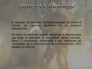 El documento describe el concepto de e-business y cómo permite a las empresas reorganizarse para intercambiar bienes, servicios, dinero y conocimiento digitalmente utilizando las TIC basadas en Internet. El e-business es posible gracias al desarrollo de grandes redes como Internet y permite a las empresas usar las TIC para procesos de negocio y transacciones. Además, el e-business proporciona un nuevo canal para conectar a las empresas con los clientes y un nuevo medio para la promoción, expandiendo los límites de la empresa.