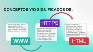 El documento proporciona definiciones y explicaciones sobre varios conceptos y plataformas relacionadas con Internet y el comercio electrónico, incluyendo WWW, HTTPS, HTML, redes sociales como Twitter e Instagram, y sistemas de pago electrónico. Describe los sistemas de pago electrónico como aquellos que facilitan pagos en línea a través de Internet entre compradores y vendedores utilizando entidades financieras autorizadas. Explica que existen varios tipos de sistemas de pago electrónico como tarjetas de crédito