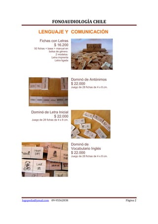 Este documento presenta una variedad de materiales educativos para la estimulación y terapia del lenguaje, la comunicación, las matemáticas, la motricidad y otras áreas. Incluye juegos, fichas, tableros, dominós y otros recursos con diferentes temáticas y precios. También ofrece accesorios para el aula como atriles, pizarras, estantes y muebles organizadores.