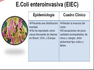 Este documento describe la bacteria Escherichia coli. E. coli es una bacteria común que vive en los intestinos de humanos y animales. Aunque la mayoría de las cepas son inofensivas, algunas cepas patógenas como E. coli O157:H7 pueden causar enfermedades graves mediante la producción de potentes toxinas. El documento discute la clasificación, historia, morfología, factores de virulencia, patogenicidad, síntomas, diagnóstico, tratamiento y prevención de las infecciones por E. coli.