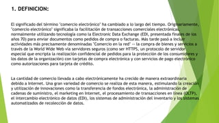 Este documento trata sobre el comercio electrónico (e-commerce). Define el e-commerce y explica cómo su significado ha evolucionado a lo largo del tiempo. Describe las características del e-commerce como la toma de decisiones basada en la tecnología y la reacción competitiva en tiempo real. También identifica diferentes clases de e-commerce como B2B, B2C y C2C. Resalta factores clave para el éxito del e-commerce como proporcionar valor al cliente y servicio. Finalmente, hace recomendaciones sobre la importancia de