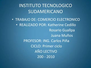 El documento define el comercio electrónico como la compra y venta de productos o servicios a través de medios electrónicos como Internet. Explica que existen tres tipos principales: transacciones B2B entre empresas, transacciones B2C entre empresas y consumidores, y transacciones C2C entre consumidores. También identifica algunas ventajas como mejor distribución, comunicación las 24 horas y beneficios operativos, así como desventajas como falta de seguridad y datos no confiables.