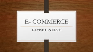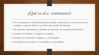 El documento define el e-commerce como la compra y venta de bienes y servicios a través de Internet. Explica que existen tres tipos de e-commerce: empresa a empresa, empresa a consumidor y consumidor a consumidor. Detalla las características y ventajas de cada uno, incluyendo la reducción de costos, ampliación de mercados y mayor comodidad para las empresas y consumidores. Finalmente, enumera algunas tecnologías clave para el e-commerce como el intercambio electrónico de datos, correo electrónico y transferencia electrónica de fondos