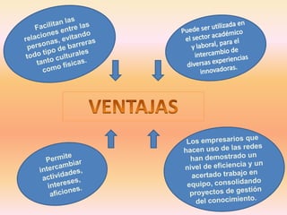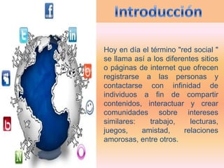 Este documento discute las redes sociales, incluyendo que permiten a las personas registrarse e interactuar con otros sobre intereses compartidos. También menciona algunos riesgos potenciales como la invasión de privacidad, convertirse en una adicción o exponer a los niños a la pornografía infantil. Finalmente, destaca que las redes sociales son dirigidas por los usuarios, son interactivas y ayudan a establecer nuevas relaciones.
