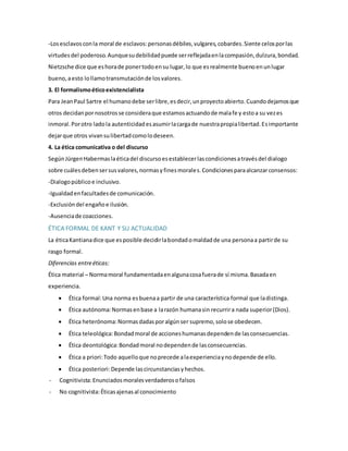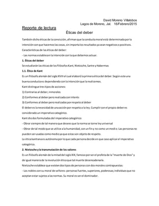 Este documento resume varias teorías éticas, incluyendo las éticas del deber de Kant, Nietzsche y Sartre. Kant propuso que una buena conducta depende de la intención con la que se realiza un acto, y que hay tres tipos de acciones: contrarias al deber, conformes al deber pero realizadas con interés, y conformes al deber realizadas por respeto. Nietzsche estableció dos tipos de personas con moralidades opuestas. Sartre argumentó que los humanos deben ser libres y