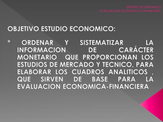 Este documento presenta un análisis financiero de proyectos que incluye la evaluación económica y financiera. Explica cómo determinar las inversiones, los costos totales, la tabla de pago de deuda, los estados financieros proyectados, el punto de equilibrio, el análisis de sensibilidad y riesgo. El objetivo es proporcionar las herramientas para evaluar la viabilidad financiera de un proyecto de inversión.