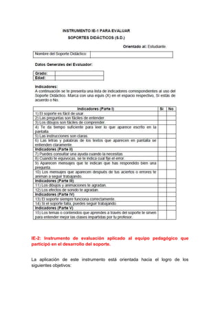 Este documento describe la etapa final de evaluación de calidad de un software educativo. Un equipo multidisciplinario utilizará cuatro instrumentos (IE-1 a IE-4) para evaluar el software desde diferentes perspectivas como estudiantes, docentes, desarrolladores y diseñadores. Luego analizará los resultados para identificar áreas de mejora y realizar las modificaciones necesarias hasta obtener una evaluación satisfactoria.