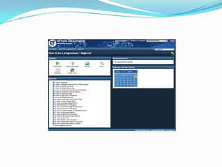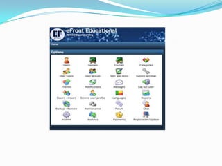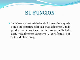 Este documento presenta la herramienta de aprendizaje electrónico eFront. eFront satisface las necesidades de formación de una organización y ayuda a que sea más eficiente y productiva. Tiene una interfaz fácil de usar y está certificada por SCORM. Además, eFront es de código abierto y cuenta con soporte profesional. Incluye una variedad de componentes para crear lecciones, pruebas en línea, comunicación, seguimiento y certificaciones.