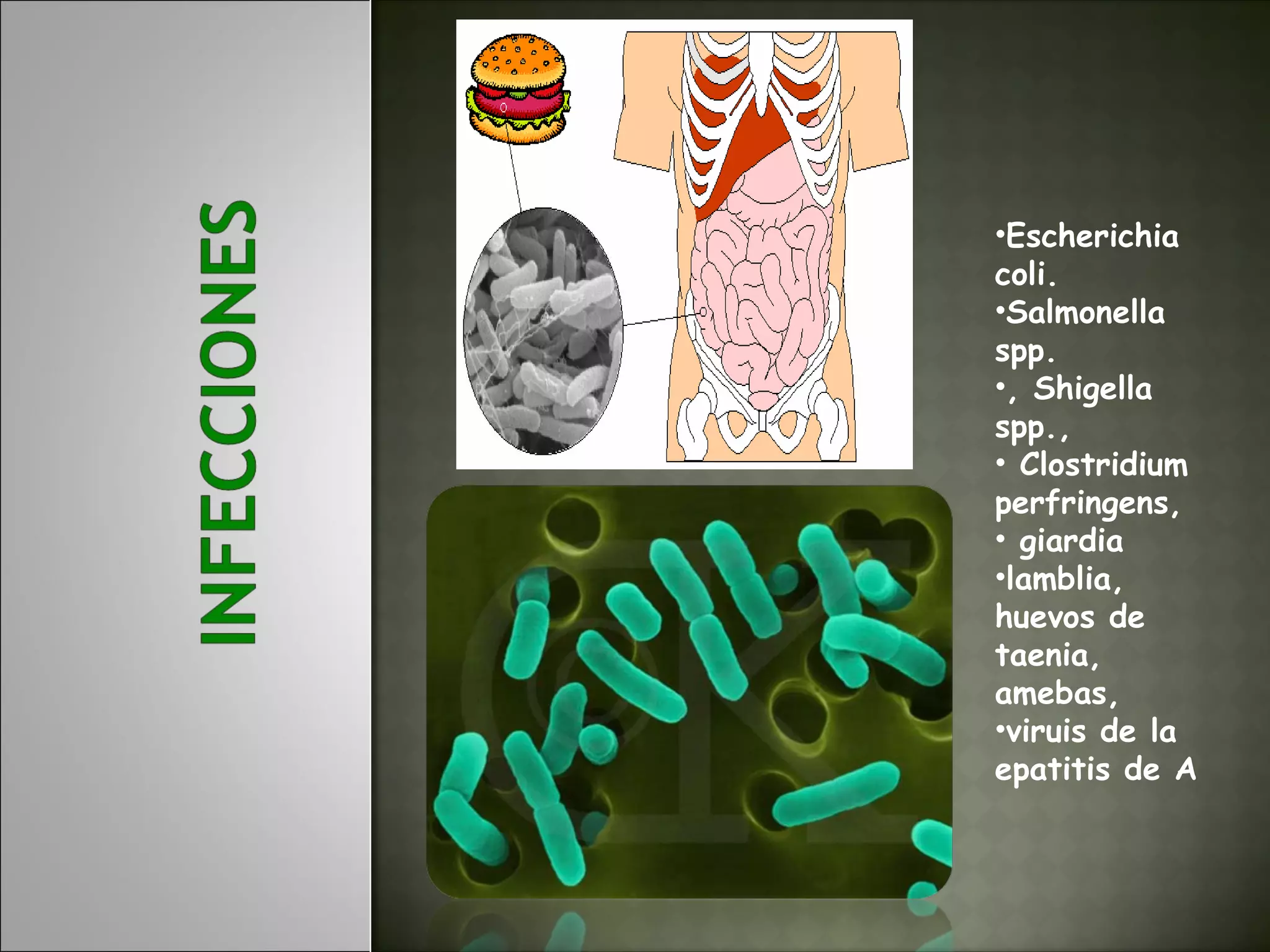 Bacterias como Escherichia coli, Salmonella spp., Shigella spp., Clostridium perfringens, parásitos como giardia lamblia y huevos de taenia, amebas y el virus de la hepatitis A son algunos de los patógenos transmitidos por los alimentos que pueden causar enfermedades.