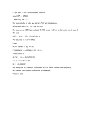 Este documento resume los pasos para calcular diferentes probabilidades asociadas a una distribución normal con media 200 y desviación estándar 15. Explica cómo transformar la variable aleatoria original X a una variable estándar Z para poder usar tablas. Luego, calcula las probabilidades de: a) P(X>224), b) P(191<=X<=209), c) P(X>230), y d) el valor de X que corresponde a una probabilidad de 0.25.