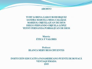 Este documento trata sobre el aborto. Explica que el aborto es la muerte del feto por expulsión natural o provocada en cualquier momento de su vida uterina. El objetivo del documento es enseñar a los estudiantes sobre el aborto y sus consecuencias, ya que es un gran problema social que afecta especialmente a los jóvenes. Define el aborto y explica que existen diferentes tipos de aborto, ya sea espontáneo o provocado, los cuales traen daños físicos y psicológicos.