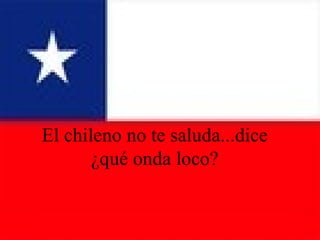 El documento describe varias expresiones y comportamientos típicos de los chilenos que difieren del lenguaje y costumbres estándar. Los chilenos no saludan, sino que preguntan "¿qué onda loco?"; no abordan el transporte público sino que van "colgando"; y utilizan muchas jergas y modismos propios en lugar de palabras formales para referirse a diversas situaciones y partes del cuerpo.