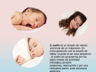El sueño es un estado de reposo del organismo caracterizado por bajos niveles de actividad fisiológica y menor respuesta a estímulos, en contraposición al estado de vigilia. La cantidad de sueño necesaria depende de la edad, aunque no existe un número fijo de horas para cada grupo de edad, sino más bien rangos promedios. Los bebés menores de 6 meses suelen dormir de 16 a 20 horas al día, mientras que los niños de 1 a 3 años necesitan entre 10 y 13 horas de sueño nocturno.