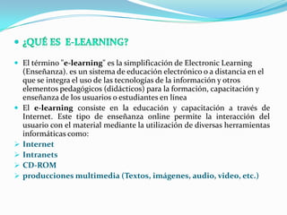 Este documento describe el e-learning y la herramienta de software AMBAR. El e-learning permite la educación en línea a través de varias tecnologías como Internet, intranets y CD-ROM. AMBAR es una herramienta basada en la web que permite a profesores y estudiantes crear y participar en procesos de enseñanza-aprendizaje basados en objetos de aprendizaje reutilizables.