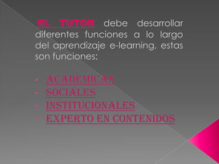 El documento proporciona orientaciones para tutores virtuales, incluyendo guiar el aprendizaje a través de la comunicación escrita, manejar herramientas del aula virtual, planificar actividades individuales y de grupo, y generar propuestas para fomentar el aprendizaje mutuo. También enfatiza la importancia de la comunicación, la participación activa del tutor para conectar al grupo con los contenidos, y desarrollar habilidades como educador virtual.