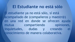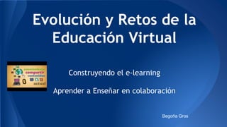 La educación virtual y el e-learning promueven el aprendizaje colaborativo donde estudiantes y profesores participan activamente. Se destacan tres elementos clave para el aprendizaje colaborativo: la situación de aprendizaje, las características del grupo y la tecnología utilizada. Las ventajas de la formación en línea incluyen flexibilidad, trabajo en equipo, comunicación fluida y la posibilidad de que el docente monitorice las necesidades individuales de los alumnos.