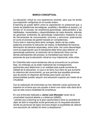 E-learning ha aumentado la cobertura de la educación en Colombia al hacerla más accesible, pero no ha aumentado necesariamente la calidad, la cual depende del estilo de aprendizaje individual. La educación virtual es mejor como complemento de la educación presencial tradicional en un modelo híbrido o b-learning, pero no la reemplaza totalmente debido a la necesidad de interacción personal y práctica en algunas asignaturas.