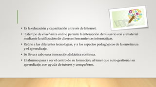 El documento describe el e-learning o educación en línea, que permite la educación y capacitación a través de Internet utilizando diversas herramientas informáticas que facilitan la interacción entre el usuario y el material. El e-learning reúne tecnologías y aspectos pedagógicos para proporcionar una interacción didáctica continua con el alumno en el centro del proceso de aprendizaje auto-gestionado con ayuda de tutores y compañeros. Tanto el docente-tutor virtual como el estudiante virtual desempeñan roles