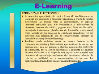 El documento define el aprendizaje electrónico (e-learning) como la educación a distancia a través de canales electrónicos como Internet, utilizando herramientas como correo electrónico, páginas web y foros. Explica que ofrece ventajas como la flexibilidad y accesibilidad, pero también desventajas como la falta de interacción personal. Finalmente, detalla algunas herramientas y características clave del aprendizaje electrónico.