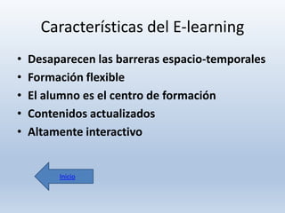 El documento presenta las características, requerimientos técnicos, aplicaciones didácticas, ventajas, desventajas y habilidades a desarrollar de diferentes modalidades de aprendizaje como el E-learning, B-learning, educación síncrona, asíncrona, autoformación, E-learning tutorizado y M-learning. Para cada modalidad, ofrece enlaces a secciones adicionales con información más detallada.