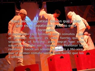 Este documento proporciona instrucciones para aprender a zapatear. Explica cómo realizar el zapateado con el pie derecho e izquierdo de forma individual, indicando que el primer remate debe ser más fuerte. Además, recomienda practicar ambos tipos de zapateado de forma repetida hasta dominarlos y poder producir diferentes sonidos según la música. Finalmente, menciona algunos de los sones más famosos de la región de Sinaloa en México.