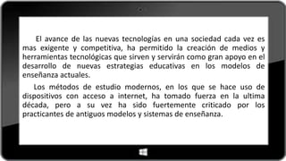 Este documento describe diferentes tipos de tecnología educativa como el e-learning, b-learning y m-learning. El e-learning se refiere a la educación a través de Internet que permite la interacción del usuario con materiales didácticos mediante herramientas tecnológicas. El b-learning es la combinación de recursos virtuales y físicos para el aprendizaje. El m-learning utiliza dispositivos móviles para impulsar procesos de aprendizaje.