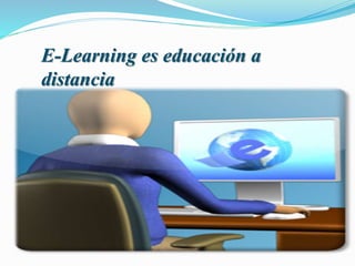 El e-Learning es una modalidad de educación a distancia en la que se utilizan medios electrónicos como Internet y herramientas como correo electrónico y páginas web para entregar material educativo de forma flexible y sin limitaciones espacio-temporales. El e-Learning permite que los estudiantes se comuniquen de forma síncrona o asíncrona con profesores y compañeros para acceder a contenidos educativos que pueden incluir texto, audio, video u otros formatos multimedia de manera interactiva.
