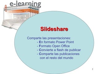 Este documento describe tres herramientas para compartir información en línea: Slideshare permite compartir presentaciones de PowerPoint u OpenOffice y convertirlas a flash; Wikispaces es una herramienta para editar documentos en línea de manera colaborativa; y Blogger permite crear un blog o bitácora cronológica inversa para compartir apuntes en línea.