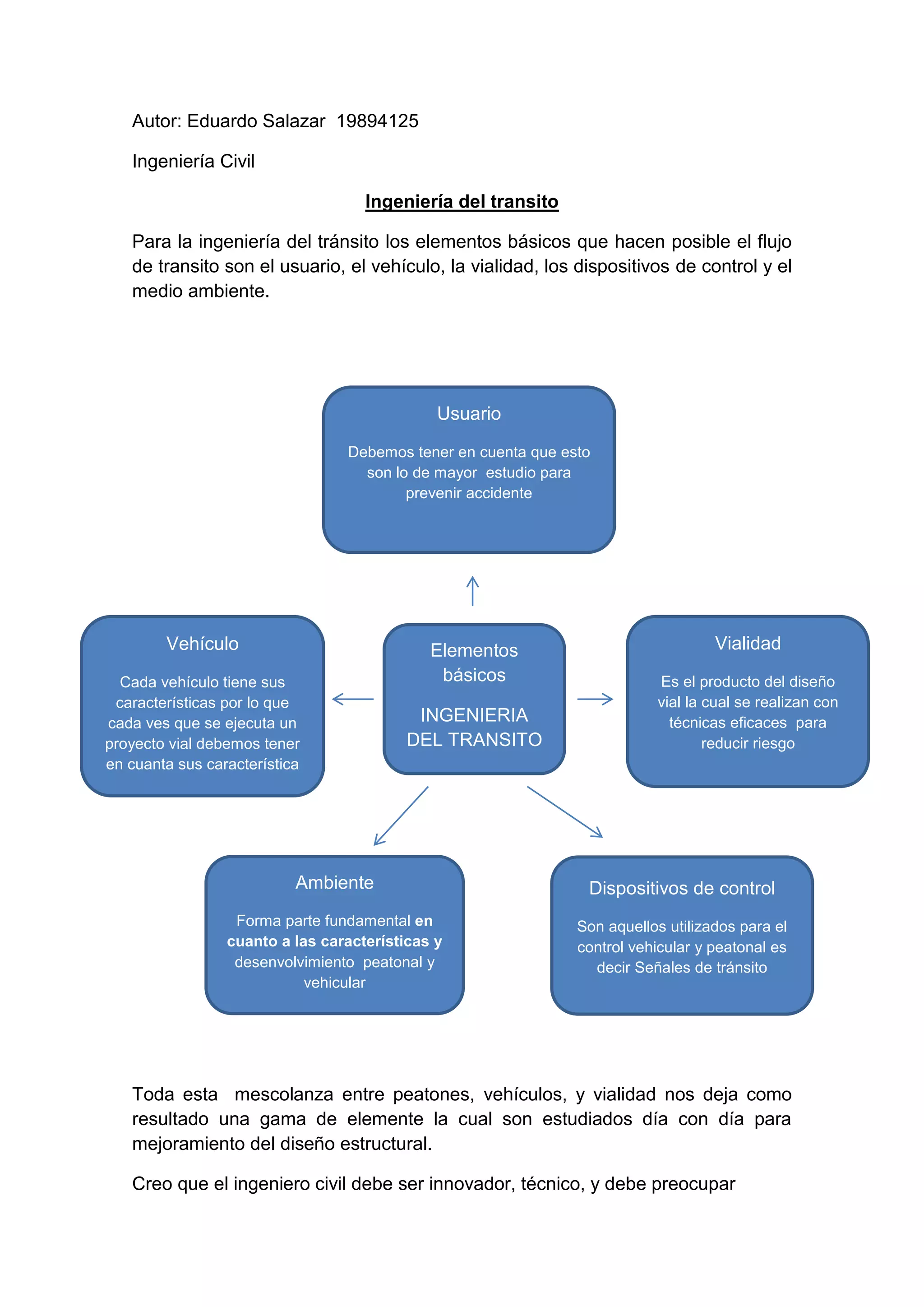 Este documento describe los elementos básicos de la ingeniería del tránsito, incluyendo usuarios, vehículos, vialidad, dispositivos de control y medio ambiente. Explica que la interacción entre peatones, vehículos y vialidad da como resultado una variedad de elementos que son estudiados constantemente para mejorar el diseño vial. Además, destaca la importancia de considerar las limitaciones, habilidades y ventajas de cada uno de los usuarios al planificar proyectos viales.