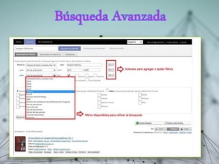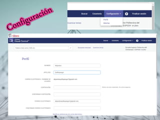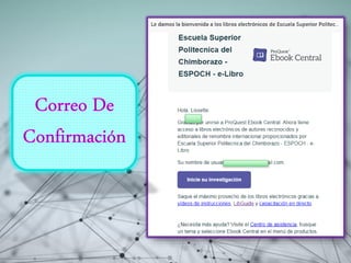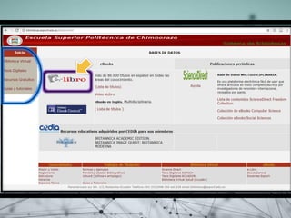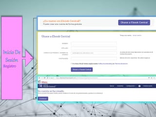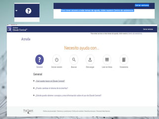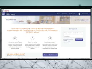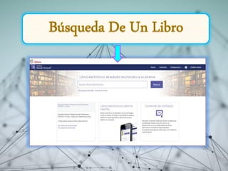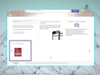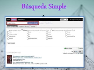 El documento describe las características y funcionalidades de una biblioteca virtual, incluyendo la capacidad de buscar en el catálogo, leer libros en línea, marcar texto, agregar anotaciones e imprimir páginas. También menciona opciones para descargar libros a dispositivos, guardar referencias y organizar notas en carpetas. Explica el proceso de inicio de sesión y registro de usuarios para acceder a más funciones como organización de perfiles y preferencias de idioma.