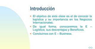 El documento resume los conceptos clave de logística, e-logística y e-business. Define la logística como la ciencia y arte de ordenar y hacer circular materiales y personas para apoyar actividades humanas. Explica que la e-logística se diferencia de la logística tradicional al ofrecer más servicios como opciones de entrega y seguimiento de pedidos. Finalmente, describe un negocio e-business como una empresa que integra tecnologías de información y comunicación con Internet para desarrollar sus operaciones.