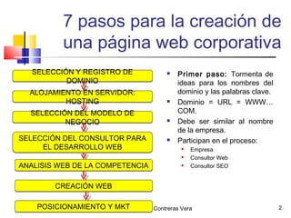 El documento describe los 7 pasos para crear una página web corporativa: 1) seleccionar y registrar el dominio, 2) seleccionar el hosting, 3) elegir el modelo de negocio, 4) seleccionar un consultor, 5) analizar la competencia, 6) crear el contenido de la web, y 7) posicionarla y realizar marketing. El objetivo es tener una página visible, funcional y que posicione bien en los buscadores.