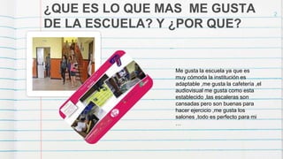 El alumno disfruta de la escuela porque es cómoda y adaptable. Le gusta la cafetería, el audiovisual y cómo está estructurada la institución, aunque las escaleras son cansadas. No le gusta que no haya rampas para discapacitados ni que las sillas estén dañadas o sucias. Propondría documentos para instalar rampas y sancionar a los estudiantes que dañan las sillas. Su materia favorita es química porque a pesar de ser difícil, poner atención hace que sea sencilla.