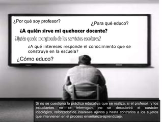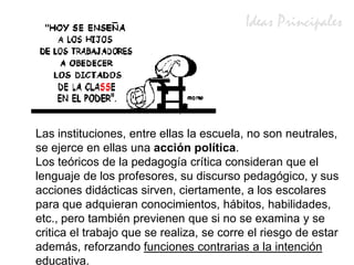 El documento discute cómo las instituciones como la escuela no son neutrales y sirven a intereses políticos. Los teóricos de la pedagogía crítica argumentan que si no se examina críticamente el trabajo educativo, existe el riesgo de reforzar funciones contrarias a la intención educativa. Se necesita ejercer la crítica para descubrir los verdaderos resultados de la acción pedagógica y en qué contexto político y económico se lleva a cabo.
