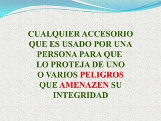 Este documento describe los diferentes tipos de equipos de protección personal (EPP) que una persona debe usar para protegerse de los peligros en el lugar de trabajo. Explica que la cabeza, cara, ojos, oídos, sistema respiratorio, manos y pies todos requieren protección adecuada dependiendo del riesgo, y que los EPP son la última línea de defensa contra lesiones. También enfatiza que los EPP solo funcionan si se usan correctamente.