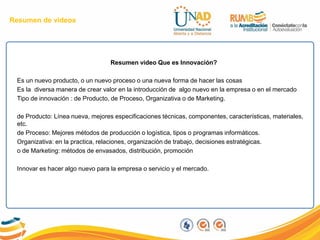 El documento aborda la innovación como un motor clave en las empresas, destacando diferentes tipos como producto, proceso, organizativa y de marketing. Se examinan estrategias para fomentar la creatividad y el trabajo en equipo, así como la importancia de la colaboración en situaciones críticas, ejemplificada en un incendio en una empresa. Además, se discute el comercio electrónico y su relevancia en la presencia digital de las empresas, además de estrategias para la creación y financiamiento de negocios exitosos.