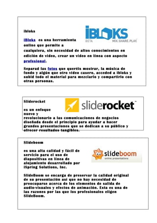 Este documento presenta resúmenes breves de varias herramientas en línea para crear y compartir presentaciones y videos, incluyendo iBloks, Sliderocket, Slideboom, Dzoom, Codigo geek, Google Presentations y Acrobat.com. Cada herramienta ofrece funciones como la creación y edición de presentaciones y videos en línea de manera fácil y colaborativa para compartir con otros.