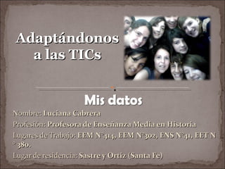 Luciana Cabrera es una profesora de historia que ha trabajado en varias escuelas de enseñanza media en Santa Fe, Argentina. A través del programa Conectar Igualdad, Luciana aprendió a utilizar nuevas herramientas tecnológicas como Foxit Reader, mapas conceptuales, hipervínculos, Wikilibro y YouTube. Ella cree que es importante que los profesores se adapten a las tecnologías que usan los estudiantes en su vida cotidiana para mejorar los métodos de enseñanza.