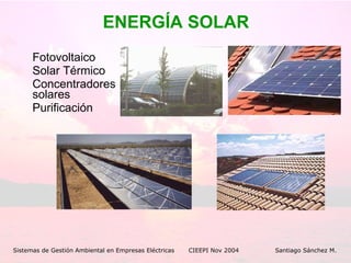 El documento trata sobre las energías renovables en Ecuador. Describe las diferentes fuentes de energía renovable como la hidroeléctrica, solar, eólica, biomasa y geotérmica. Explica el potencial energético de cada fuente en el país y sus efectos ambientales. También habla sobre la gestión ambiental de proyectos de energía renovable e incluye estudios preliminares de impacto ambiental.
