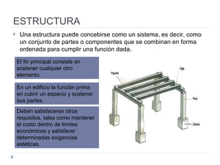 El documento describe los diferentes tipos y componentes de las estructuras arquitectónicas. Explica que una estructura es un sistema que combina partes para cumplir una función como cubrir un espacio y sostener sus partes. Luego describe los tipos de estructuras según su origen, movilidad y función, incluyendo columnas, vigas, tirantes y muros. Finalmente, explica los componentes de una estructura como la cimentación, sistema de piso, elementos verticales de soporte y cubierta.