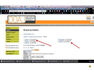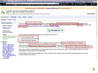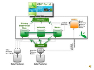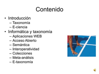 El documento explora la intersección entre la informática y la biología, centrándose en la e-taxonomía, que se refiere a la utilización de tecnologías informáticas para mejorar la clasificación y el análisis de la biodiversidad. Se discuten aplicaciones como la ciberinfraestructura y la e-ciencia, destacando su papel en la creación y gestión de datos biológicos, así como en la colaboración entre investigadores. Además, se aborda la importancia de la interoperabilidad y los estándares en el manejo de datos biológicos a través de la web semántica.